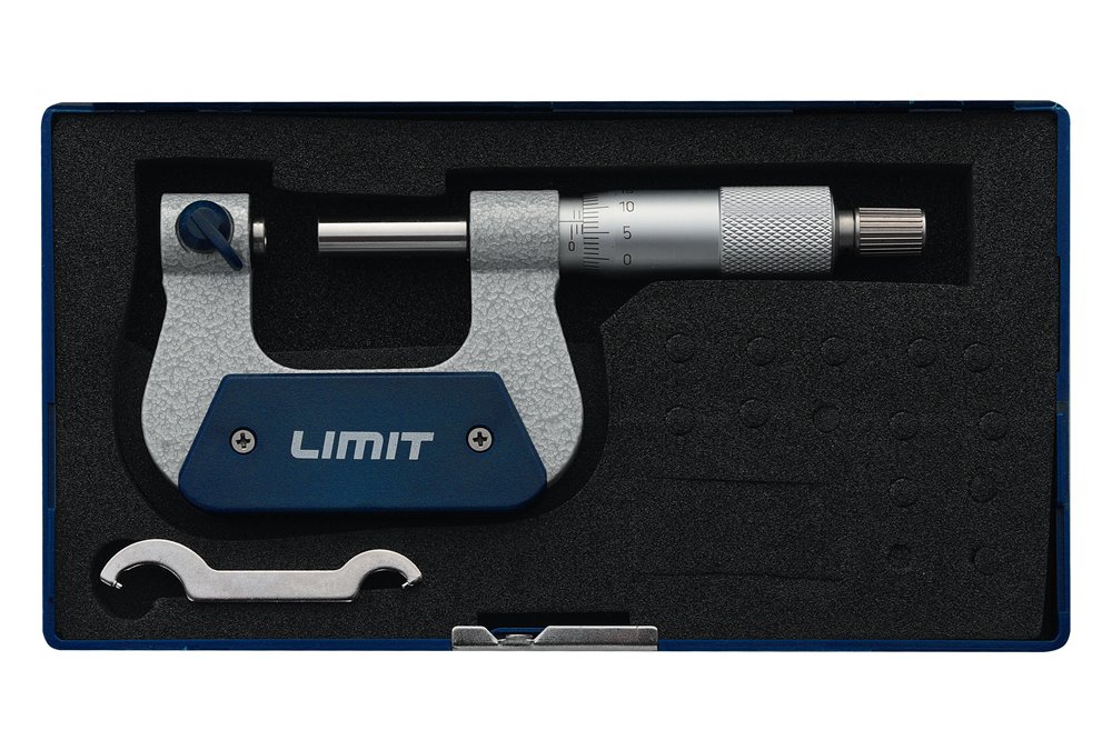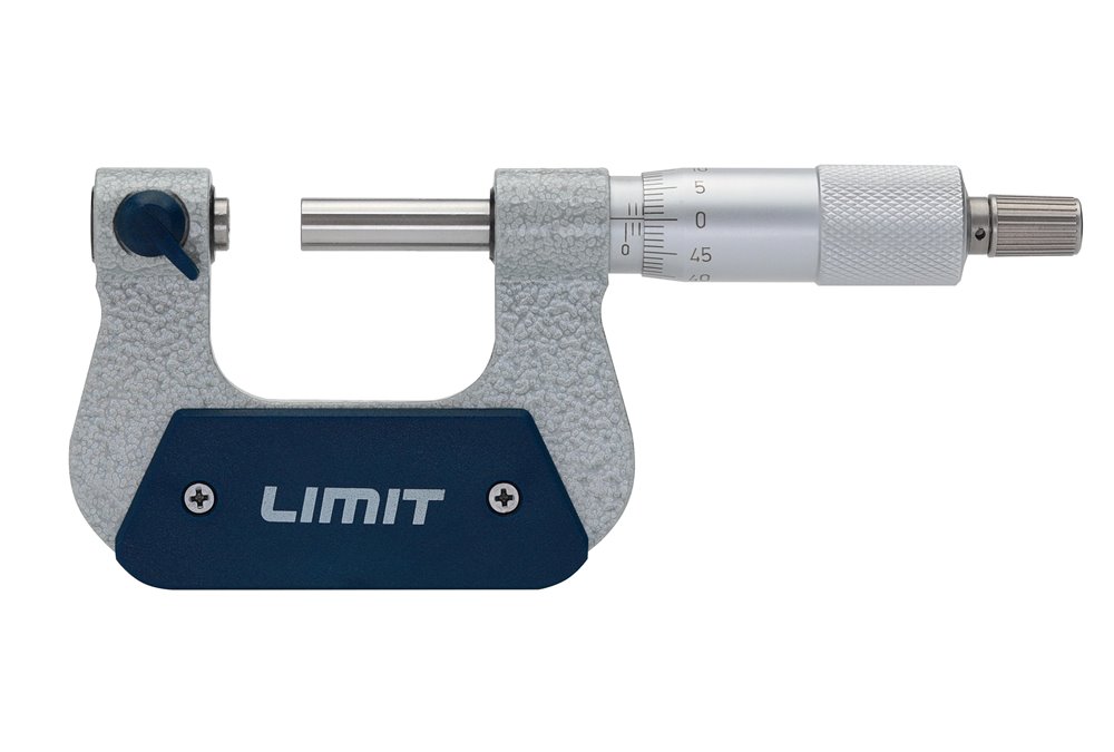 Mikrometr z kabłąkiem okuwanym i podziałką chromowaną na mat. Hartowane wrzeciono z wymiennymi końcówkami pomiarowymi dla różnych skoków gwintu (końcówki nie są załączone). Z tuleją ze sprzęgłem ciernym i dźwigienką ustalającą. DIN 863.