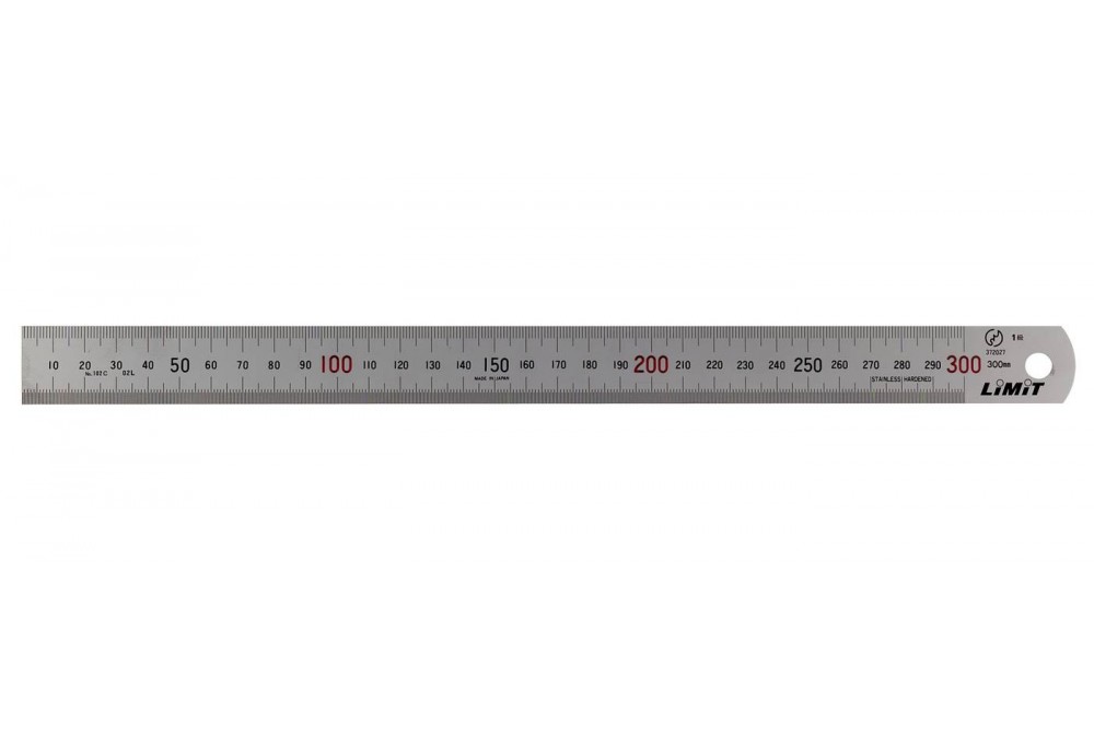Z hartowanej stali nierdzewnej. O chromowanej na mat powierzchni, do bezodblaskowego odczytu. Przy krawędzi górnej podziałka o rozdzielczości 1 mm, a przy dolnej - 0,5 mm. Tylna strona błyszcząca.