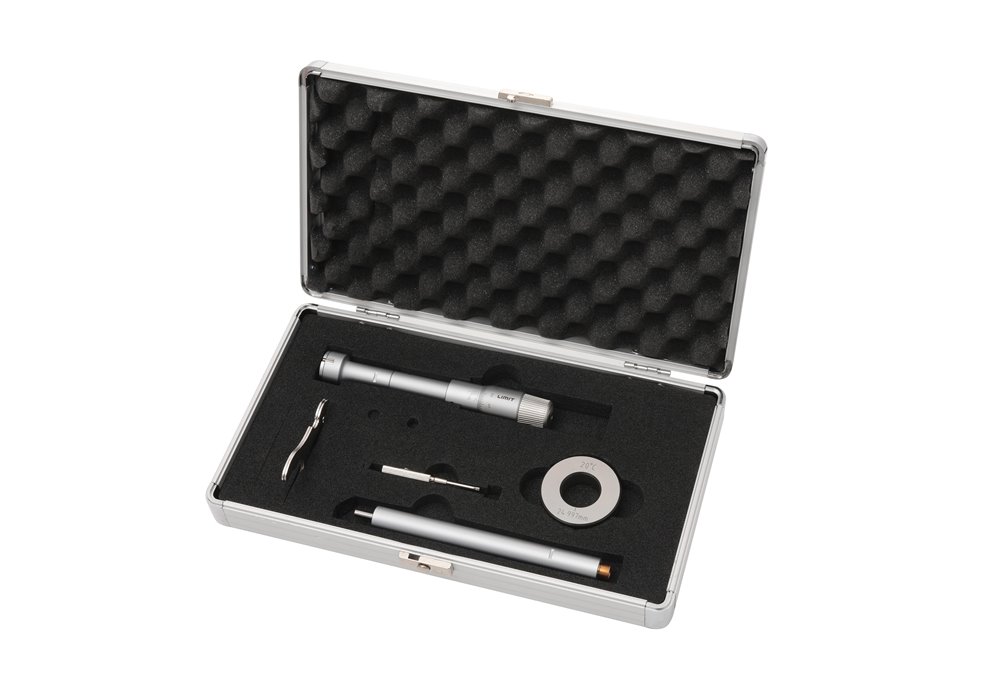 Średnicówka mikrometryczna trójpunktowa wraz z zestawem końcówek do pomiaru średnic wewnętrznych. Ze sprzęgłem ciernym, które zapewnia stałą siłę pomiarową i samocentrowanie średnicówki. Powierzchnie pomiarowe z węglików spiekanych. Końcówki pomiarowe umożliwiają pomiar na głębokości do 0.5 mm od dna otworu. W załączeniu pierścień kalibracyjny. Jeden zestaw zawiera cztery mikrometry w rozmiarach 20-50 mm, a drugi zestaw 63-100 mm, ponadto po 2 pierścienie regulacyjne w każdym zestawie. Średnicówki dostarczane są z przedłużaczami i pierścieniami kalibracyjnymi. Wykonanie zgodnie z DIN 863/4.