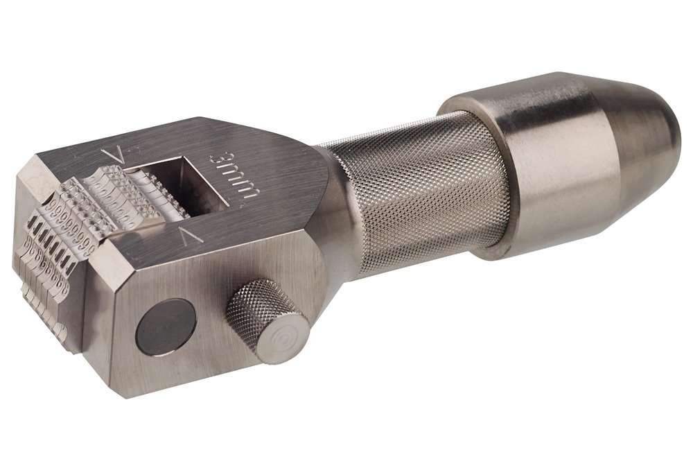 Kompaktowy znakownik z 8 kółkami stemplowymi, do stali i innych metali. Do wybijania znaków w materiale o wytrzymałości na rozciąganie do 150 kG/mm². Wykonanie ze stali narzędziowej o specjalnych właściwościach zapewniających wysoką wydajność. Umieszczony w pudełku z tworzywa sztucznego.Mocna, zwarta budowaWymienna górna, udarowa część trzonkaWszystkie części składowe są standardowe i wymienneSymbole zgodne z DIN 1451Część robocza stempli hartowana do 58–61 HRCNiklowany dla ochrony przed korozją